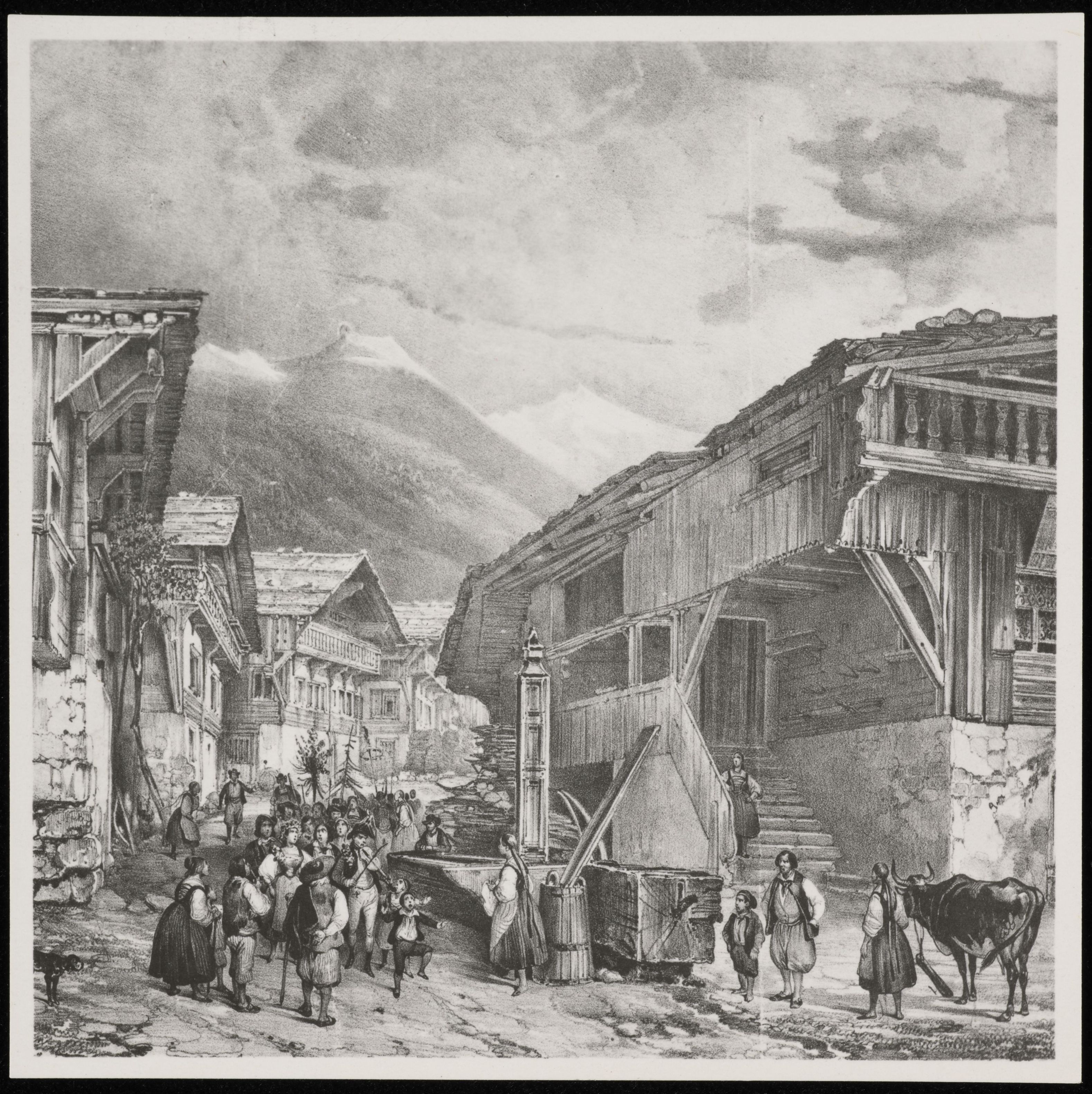 [Zeichnung der Titelseite des deutschen Koorblattes mit Szene aus Bergdorf]