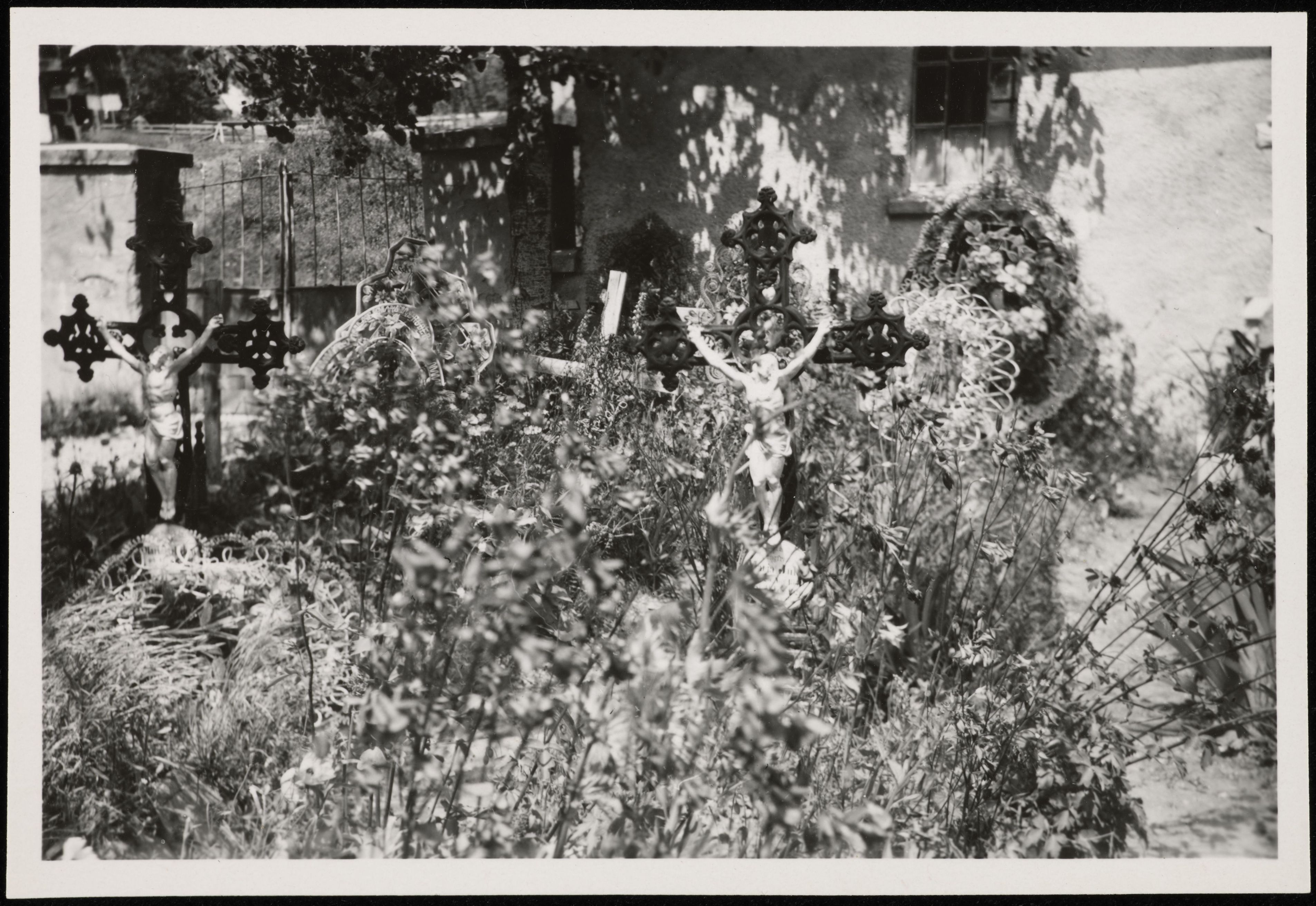 [Friedhof mit Grabkreuzen und Gräsern dazwischen]