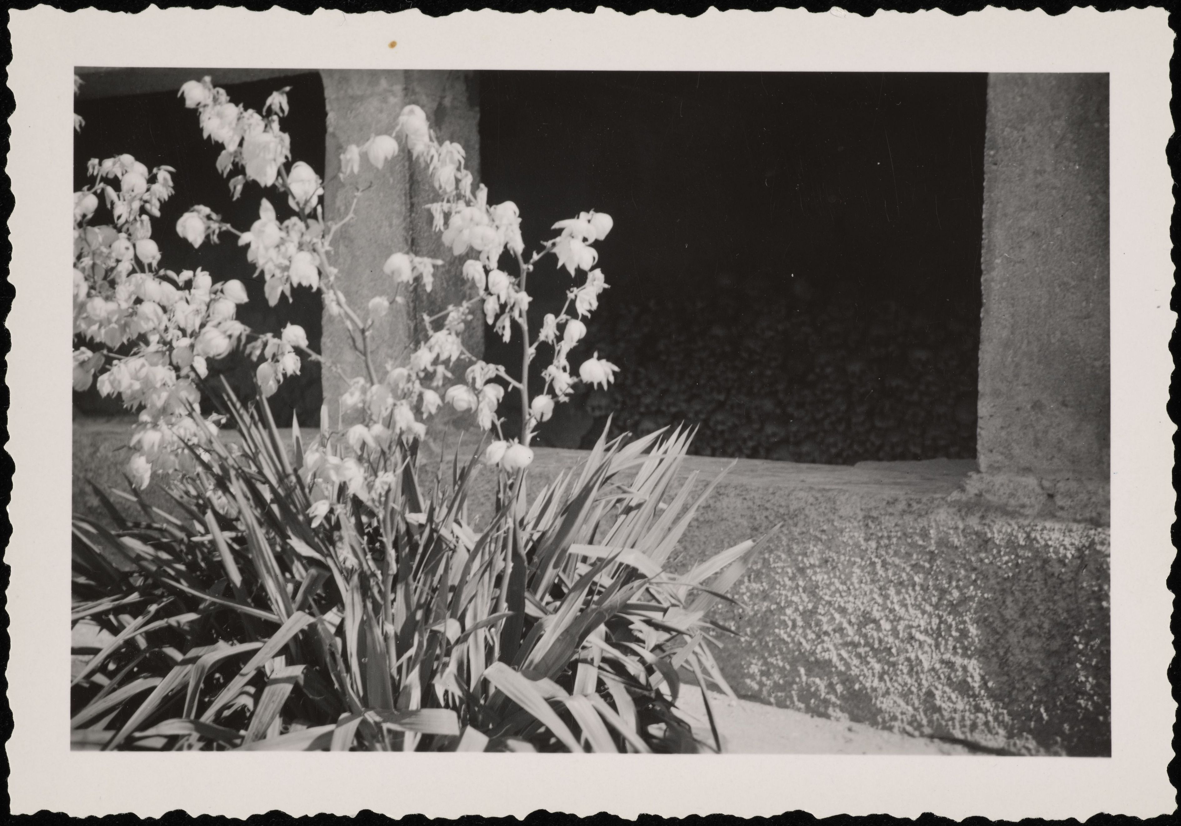 [Nahaufnahme von Blumen mit Gebeinhaus im Hintergrund]