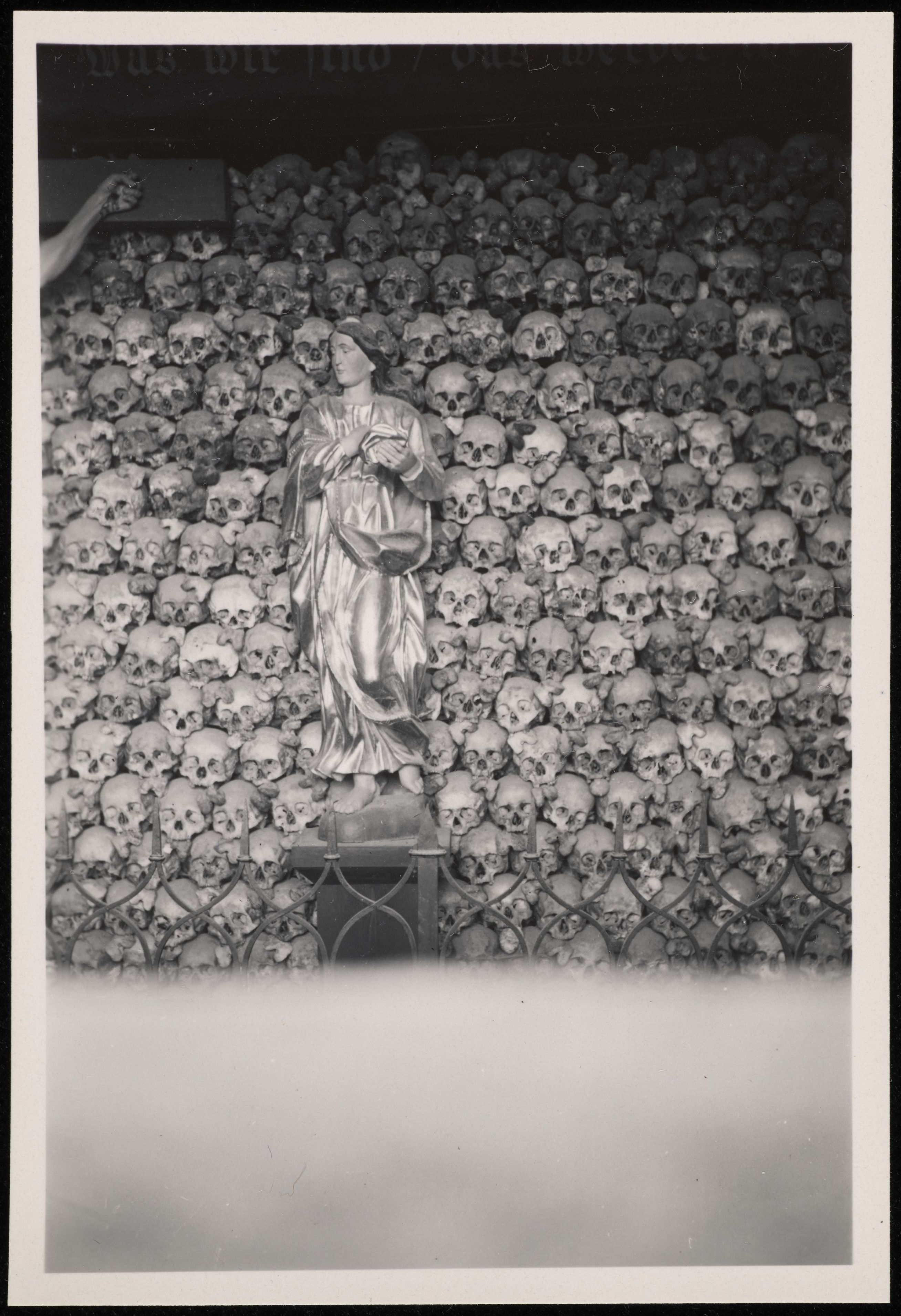 [Gebeinhaus mit Schädel und Statue]