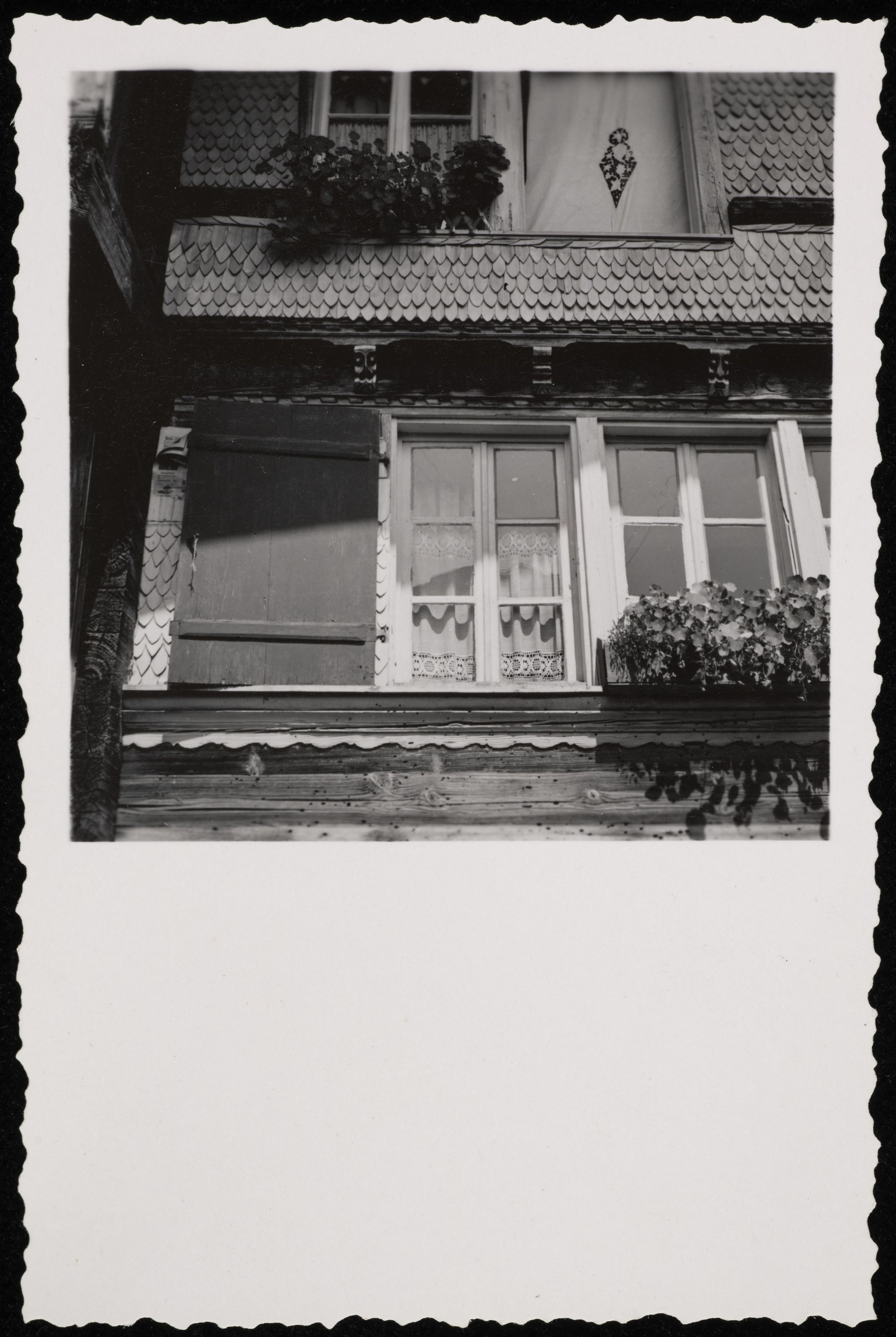 [Schindelfassade mit Holzverzierung von geschnitzten Gesichtern]