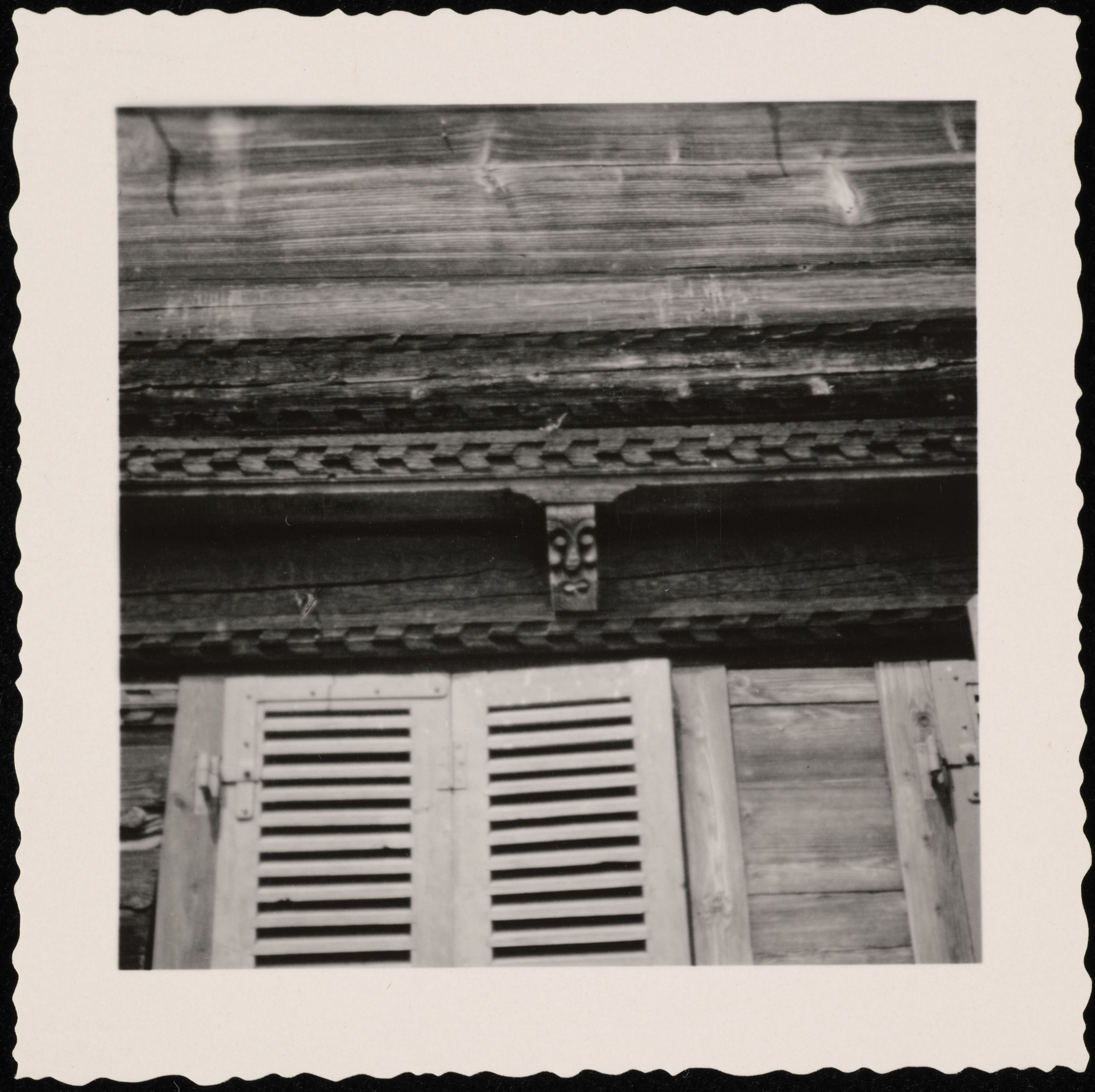 [Nahaufnahme der Verzierung der Holzfassade mit geschnitztem Gesicht]