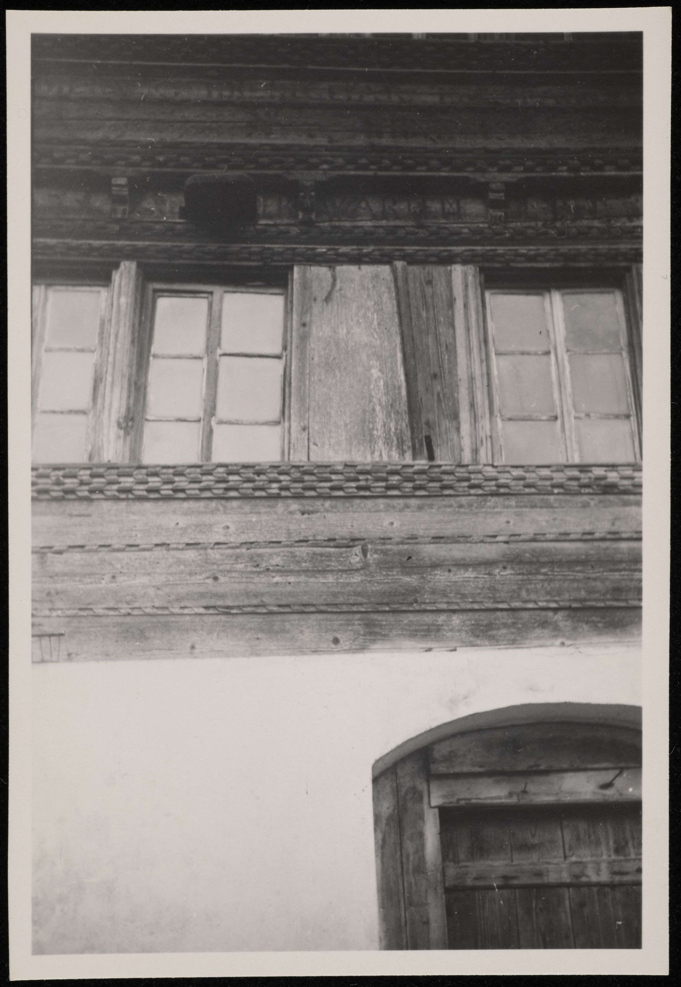 [Nahaufnahme vom Eingang und den Holzverzierungen in der Fassade]