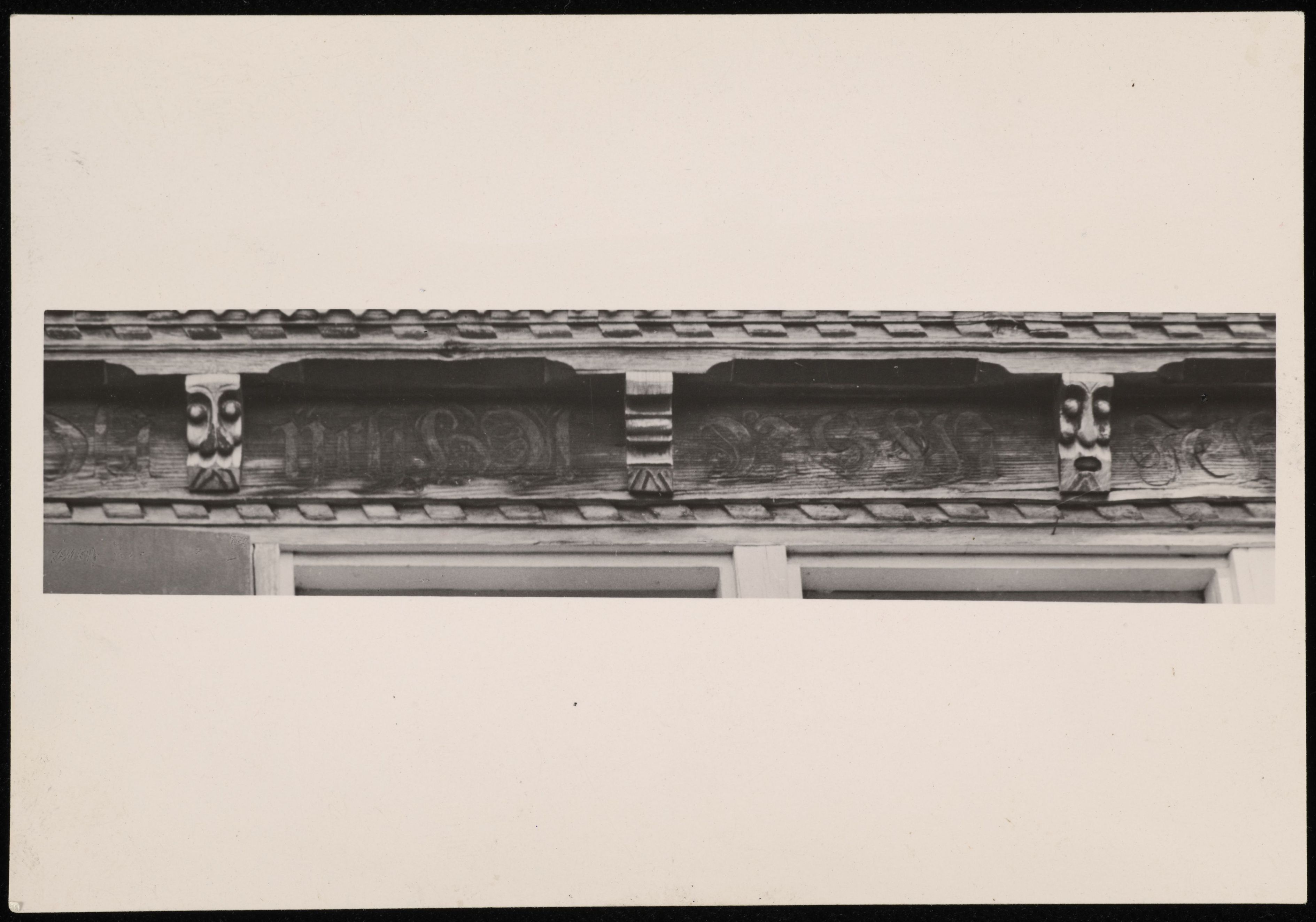 [Nahaufnahme der Verzierung der Holzfassade mit Inschrift]