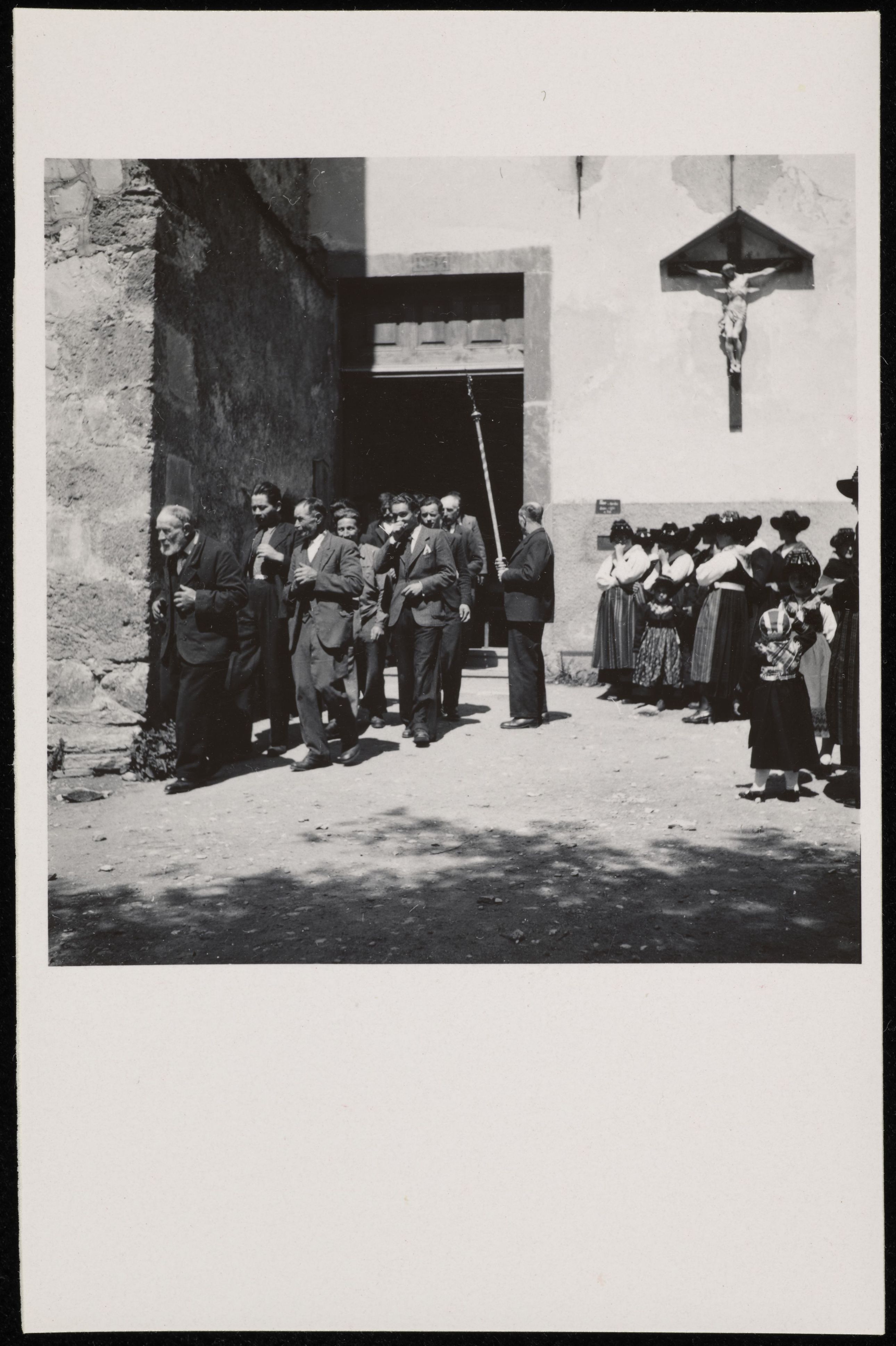 [Frauen in Tracht und Männer im Anzug beim Verlassen der Kirche]