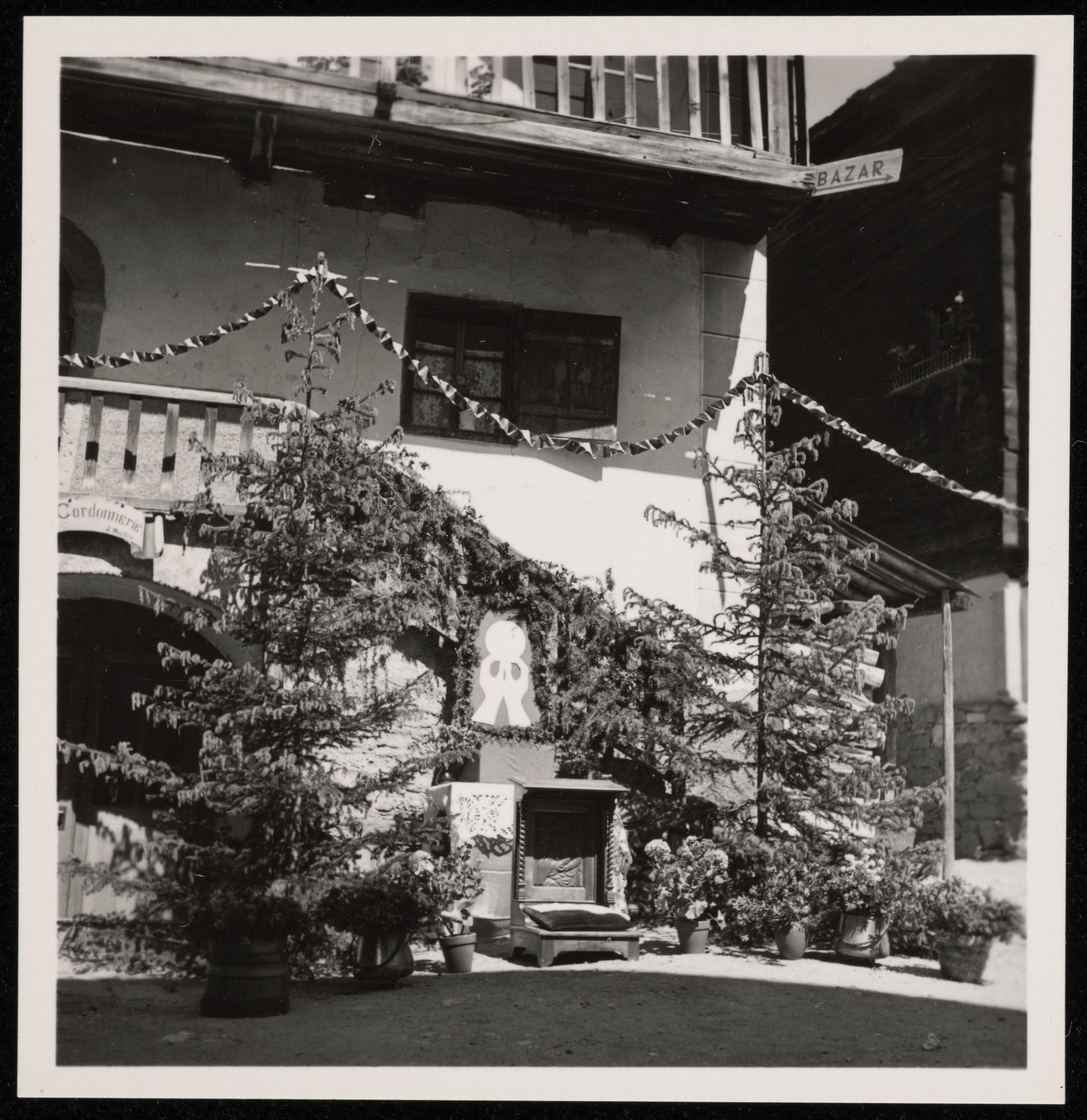 [Verzierung von Bäumen und Gebäuden fürs Fête du Sacré-Cœur]