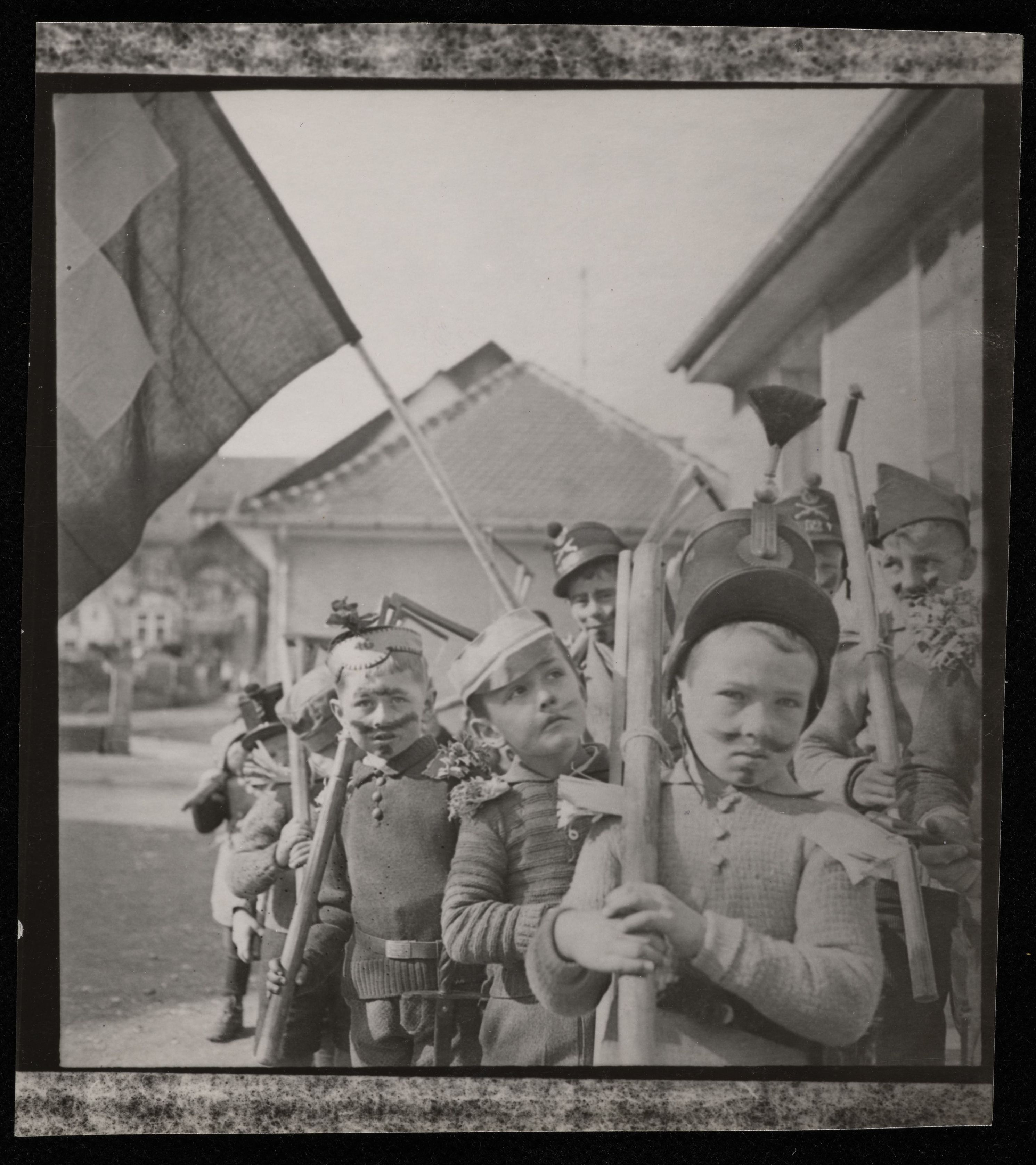 [Als Militär verkleidete Knaben an Aschermittwoch in Barzheim Schaffhausen mit Fahne]